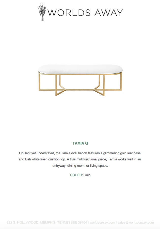 SKU: worlds-away-6676629127216 Categories: Benches, Brands, Furniture, New, New Arrivals, Seating, Worlds Away Tags: Furniture, Gold bench, Tamia, Upholstered bench, Worlds away, Worlds Away Benches, Worlds away furniture, Worlds away seating