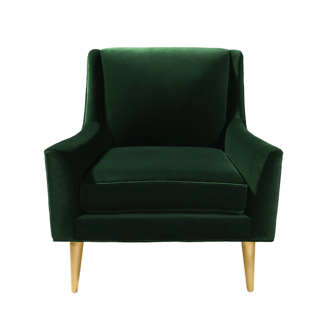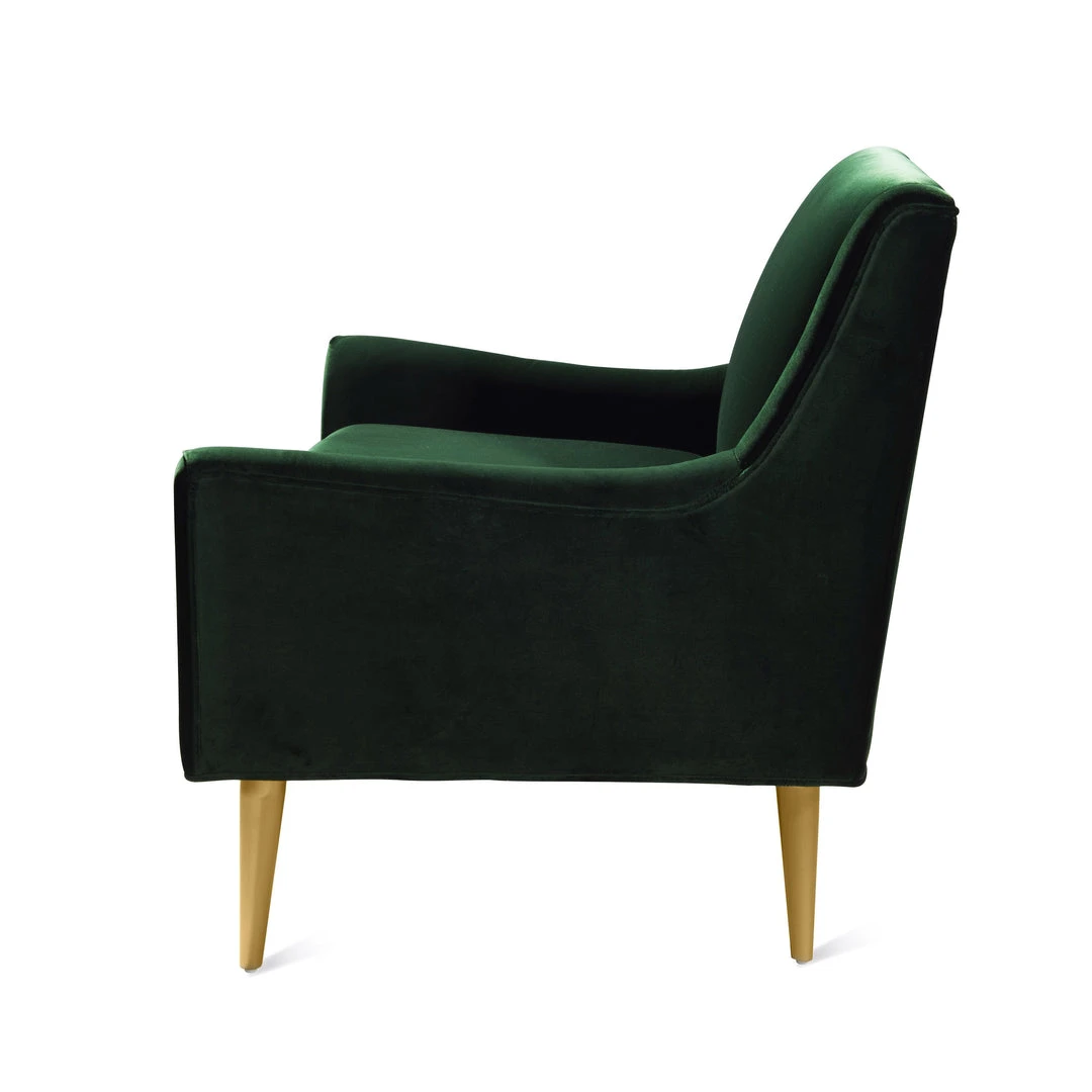 The Worlds Away Wrenn Chair in Green Velvet showcases plush upholstery with warm brass metal legs. The Wrenn is inspired by contemporary style and is perfectly paired with an equally sleek design. The Wrenn is a sophisticated mix of comfort and luxury and is ideal seating for your den, bedroom, home office or living room. *Upholstery is foam fill and spot cleaning is recommended.